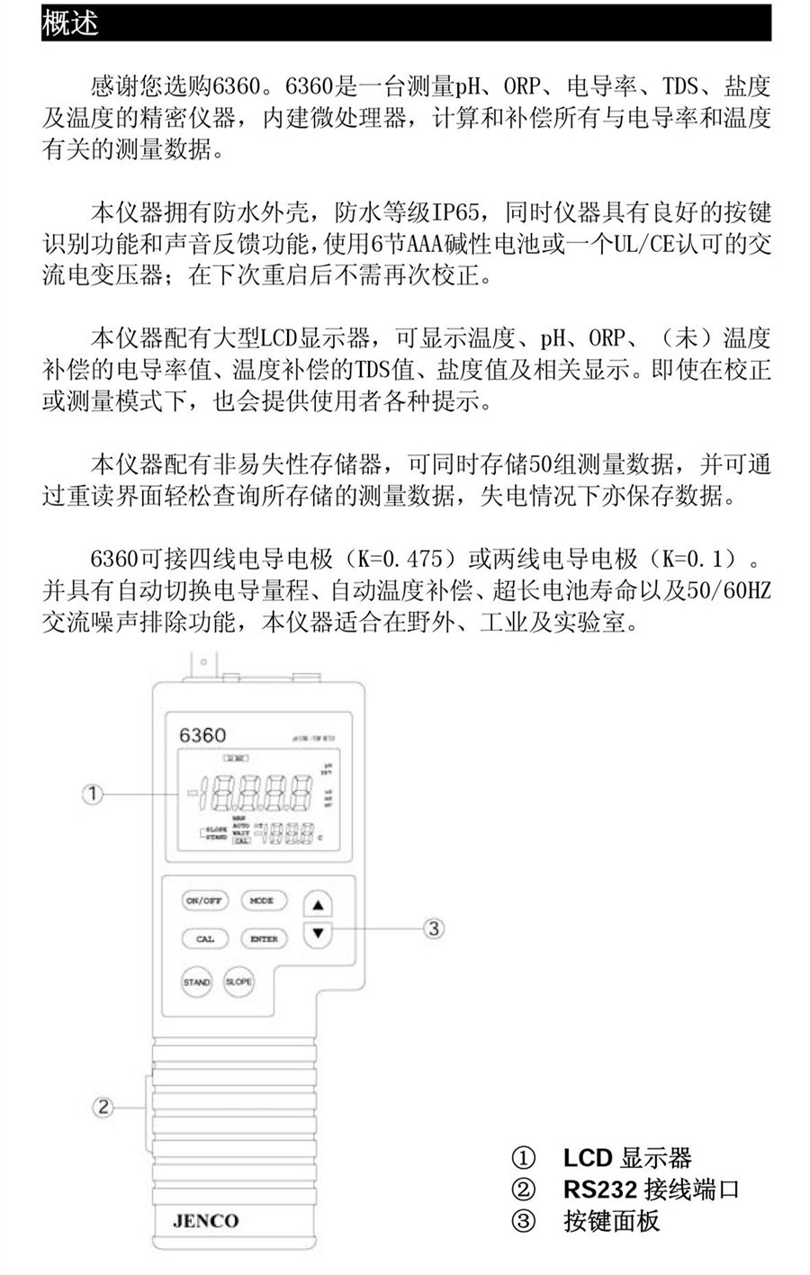 6360為手提式pH/CON/SAL/mV/TEMP.檢測儀,具防水外殼、RS-232C界面,供儀器與各個IBM兼容PC連結。本儀器pH分辨率與mV范圍為0.1,鹽度范圍為0.0至80.0ppt(分辨率0.0ppt)。可選擇性導電電池(K=1.0 or K=5.0)與其范圍為(uS或mS.)。