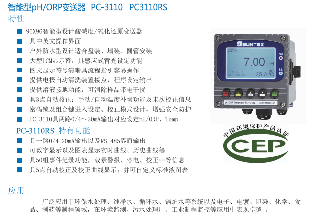 SUNTEX (中國環境保護認證)智能型pH/ORP變送器PC-3110  PC3110RS